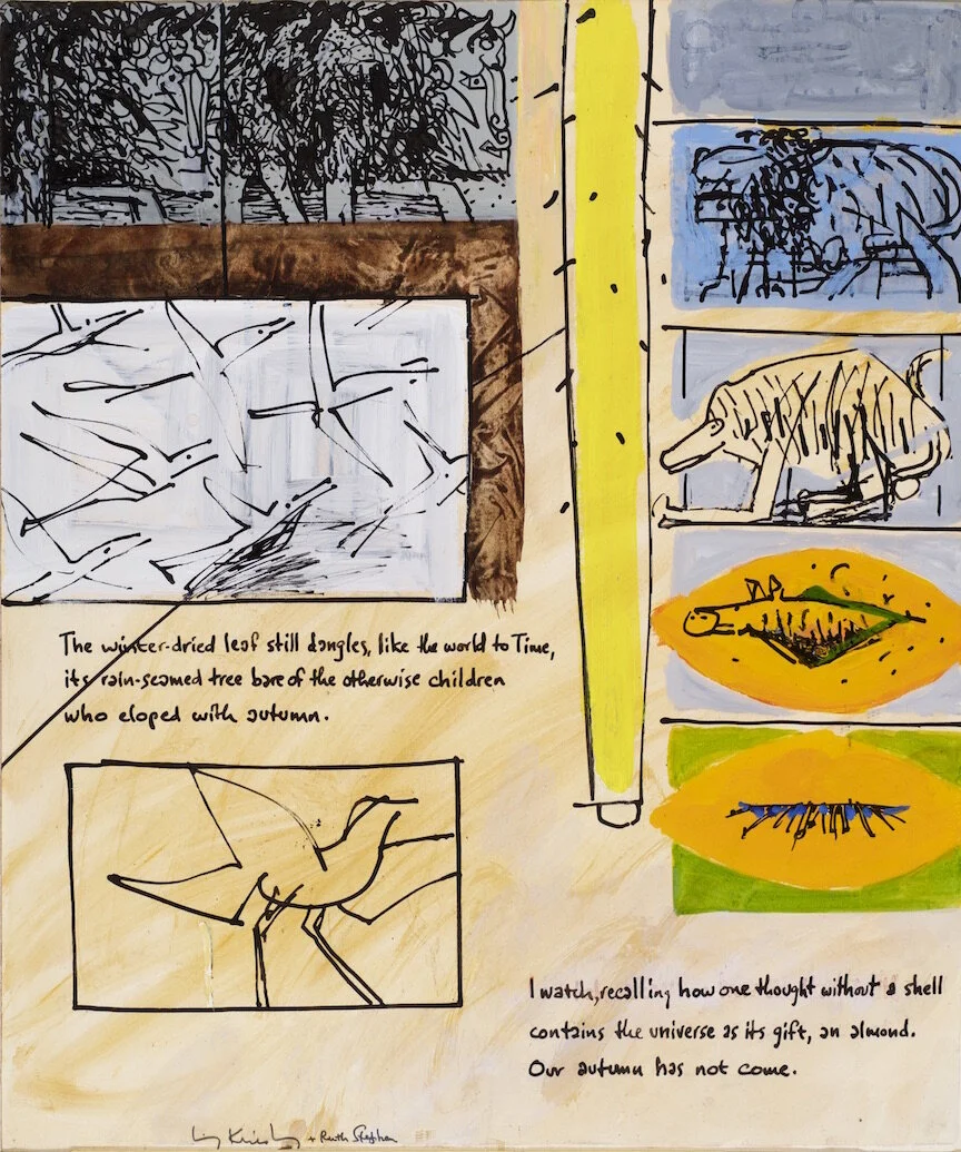 Poetry was an important influence on Kriesberg’s art, frequently referenced in both titles of works and in the lyrical nature of his metaphorical imagery. Between 1964 and 1965, Kriesberg collaborated on a series of ‘poem board’ paintings with his first wife, the poet Ruth Miller, and another poet named Ruth Stephan. Below is a virtual presentation of these collaborative poem/painting hybrids.